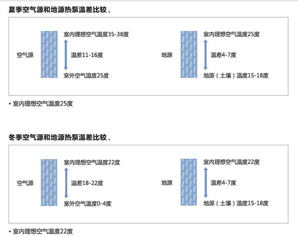 地源热泵是利用地球表面浅层水源(如地下水、河流和湖泊)和土壤源中吸收的太阳能和地热能,并采用热泵原理,既可供热又可制冷的高效节能空调系统。相对于普通空调(空气源热泵)而言,地源热泵是一种新技术,简单地说即将普通空调的换热源改到土壤或自然水中,也就是夏天将室内的热量送到土壤或自然水中,而冬天从土壤或自然水中提取热量到室内。土壤或自然水的温度无论冬夏恒定在15-20℃左右,而空气温度因冬夏或白天夜晚变化很大,从2-40℃左右,换热源温差很大,导致COP值波动很大,能耗极高甚至无法工作。